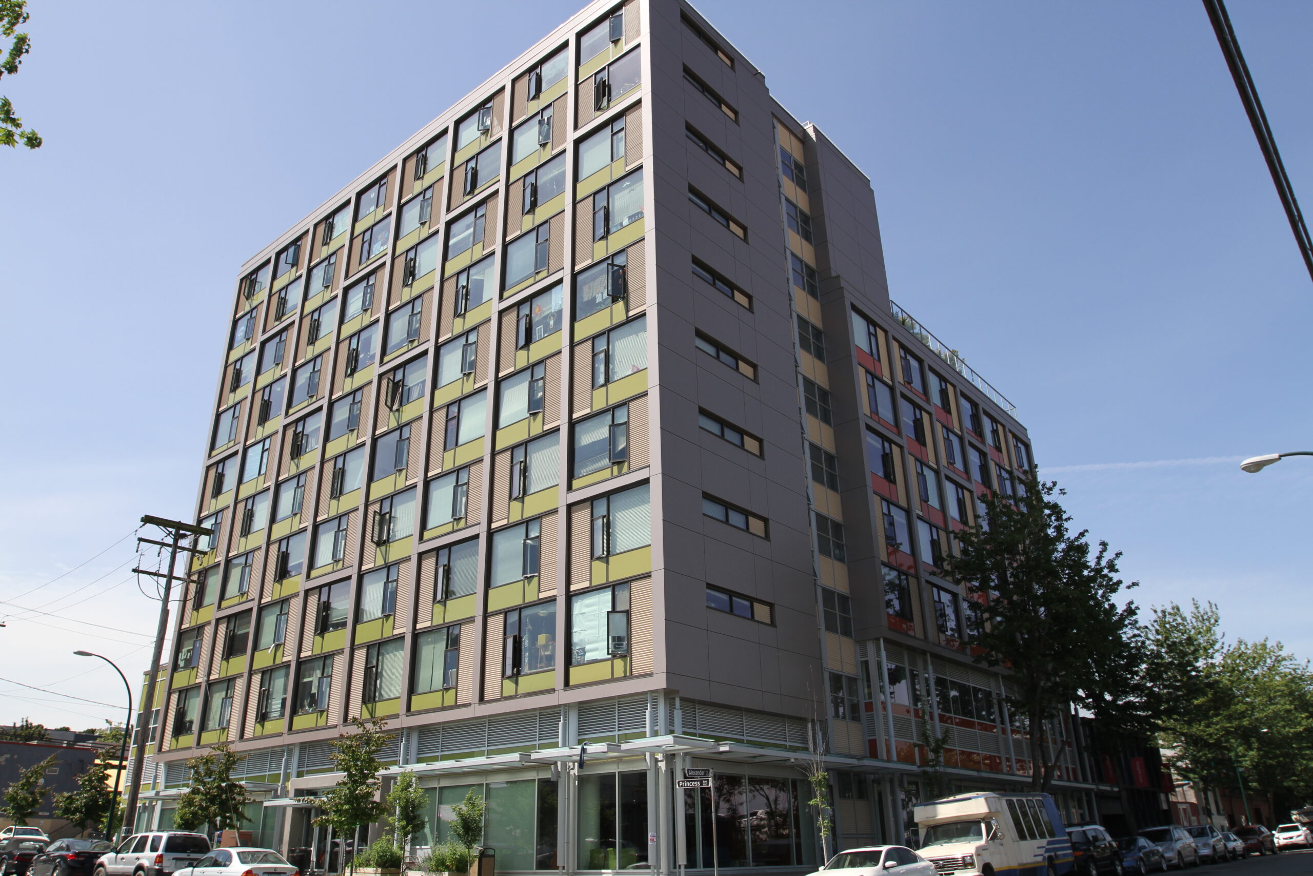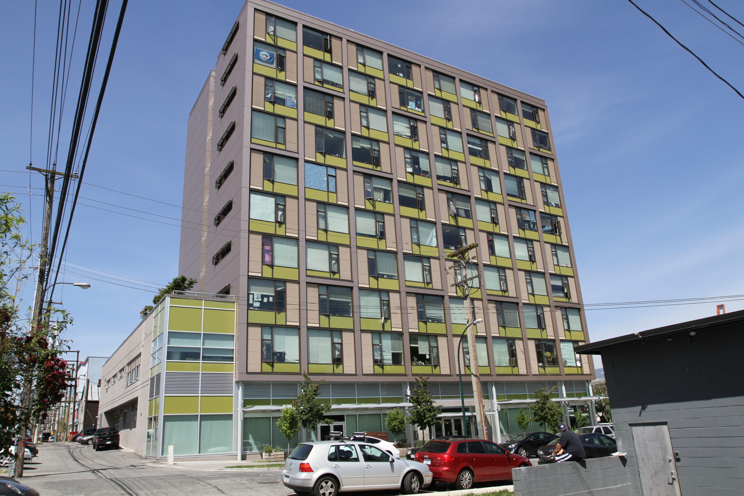 A non-market residential building comprised of 139 single room occupancy style apartments. The building consists of two parts, a 7 storey tower connected to a 10 storey tower, which provides the residents with two rooftop patio areas perfect for socializing and gardening.