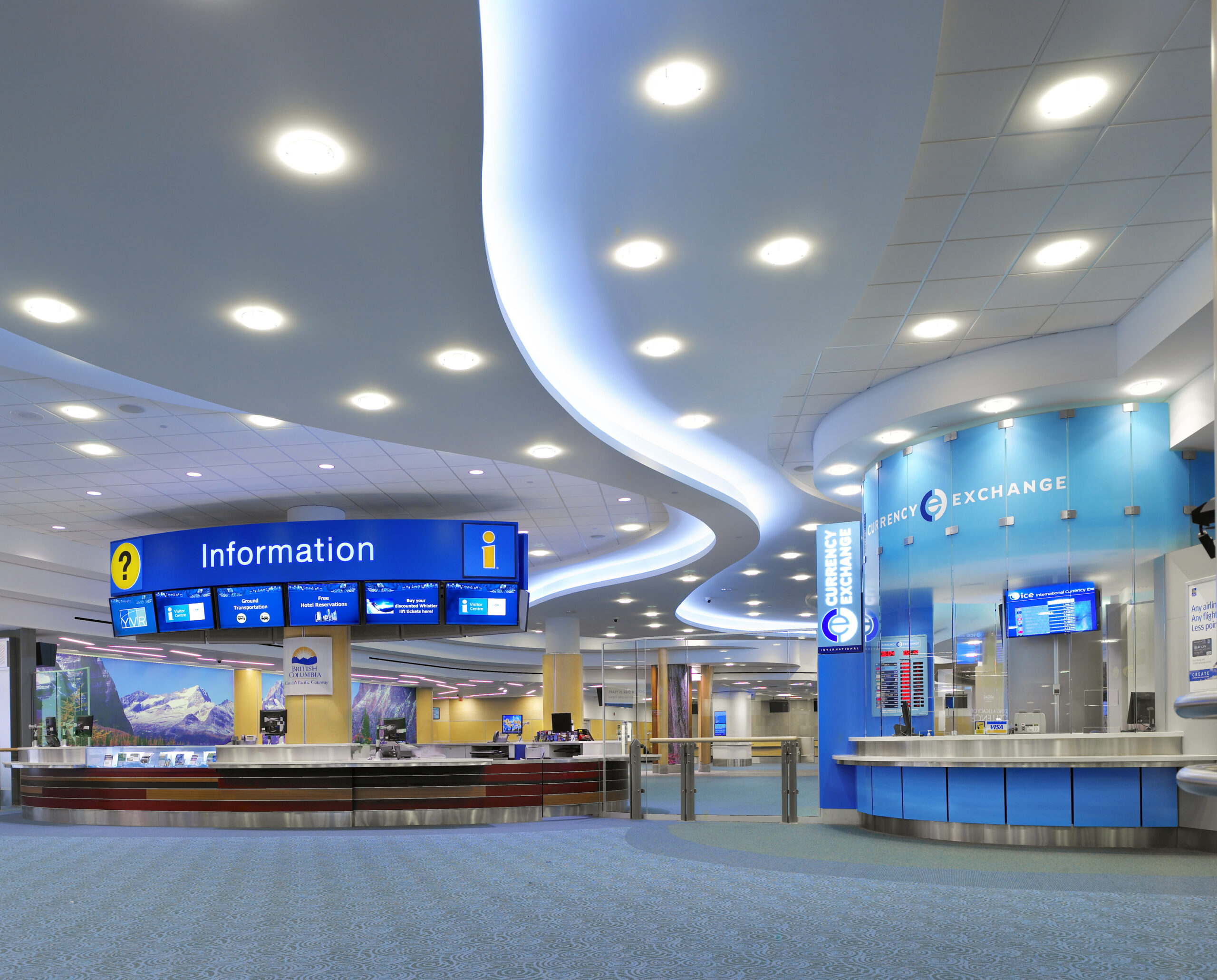 Features of the project include a “Log Jam” lighting arrangement as you exit the customs hall. In front of the rock wall feature, you will see canoes travelling down a river made of LED lighting and drywall bulkheads.